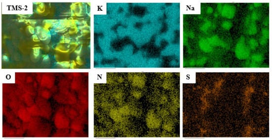 The EDS mapping spectrum of TMS-2 molten salt is presented in Figure 14. The position and distribution of each element can be clearly observed from Figure 14. The content of the Na element in TMS-2 molten salt was lower than that of the K element, which was consistent with the designed molten salt ratio. Figure 14 also shows that the K and Na elements in TMS-2 molten salt exhibited a certain complementary distribution. The formation of this complementary distribution structure may be related to the strong repulsion between K+ and Na+. The uniform distribution of sulfate ions within the Na element distribution area indicated a stronger binding force between sulfate ions and sodium. The strong repulsion between K+ and Na+ and stronger binding force between sulfate ions and sodium may have resulted in higher specific heat of TMS-2 molten salt than that of solar salt.