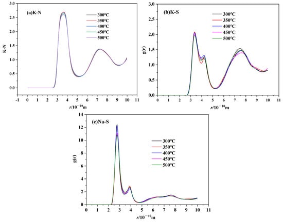 RDF can be used to describe the basic structure of molten salts. The RDFs of cation–anion and cation–cation for TMS-2 molten salt at 300 °C, 350 °C, 400 °C, 450 °C and 500 °C are shown in Figure 15 and Figure 16. All RDFs exhibited the following same features: a relatively high first peak followed by some lower peaks, and the peaks approaching unity at a larger distance. It is noted that the arrangement of ions in the molten state of TMS-2 exhibited long-range disorder and short-range order. It can be seen that the first cation–cation peak was wider and its peak valley was higher than that of cation–anion, which was because a strong coordination structure was formed between cations and anions. Meanwhile, the cation–anion curves were opposite to the corresponding ones of cation–cation, indicating that cations and anions were regularly interlaced.
