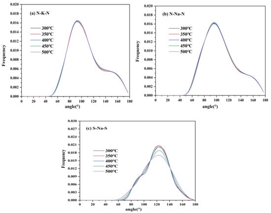 Figure 17 shows the ADF of cation–anion pairs of TMS-2. It is noted that the bond angles of TMS-2 were distributed within the range of 30–180°. The bond angles of N-K-N and N-Na-N were relatively concentrated and slightly higher than 90°, indicating that the coordination bond orientation was regular and tended to form a loose octahedral coordination structure. The peak of N-K-N was higher than that of N-Na-N and closer to 90°, indicating that the octahedral coordination configuration of N-Na-N was more significant than that of N-K-N. The bond angle of S-Na-S was mainly concentrated around 120°, indicating a regular orientation of coordination bonds and a tendency to form loose tetrahedral coordination structures. The peak intensity of the S-Na-S bond angle became weak as the temperature increased, indicating that as the temperature increased, the interaction between ions weakened, the randomness of molecular motion increased, and the micro clusters of molecules became somewhat loose.