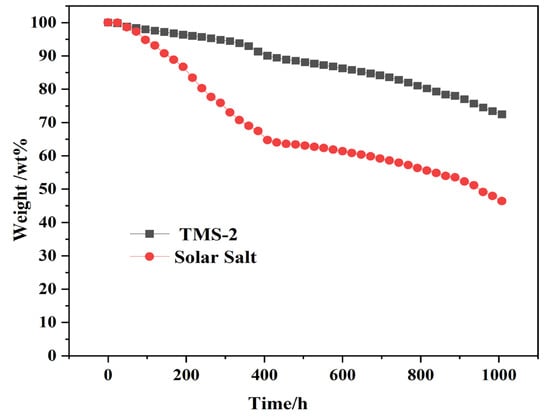 The upper limit of the use temperature of molten salt is limited by its stability at high temperatures. Generally, the upper limit of the use temperature is about 50 °C lower than the decomposition temperature. The long-term stability of TMS-2 molten salt and solar molten salt at 550 °C was investigated, as shown in Figure 18. It can be seen that at 550 °C, the weight loss of solar salt was significantly higher than that of TMS-2 molten salt. The weight loss further increased as time went on. After 1008 h, the weight loss of solar salt was as high as 53%, while the weight loss of TMS-2 was only about 27%. This indicated that TMS-2 has better stability at 550 °C.