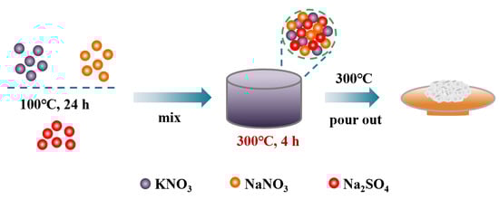 NaNO3, KNO3 and Na2SO4 were dried in a constant-temperature air-drying oven at 80 °C for 24 h to remove moisture from raw materials. In this study, molten salts were synthesized by the static melting method. Briefly, 20 g binary salt of 60wt% NaNO3-40wt% KNO3 and ternary eutectic salt of TMS with different proportions, calculated according to the phase diagram in the literature [37], as shown in Table 3, were mixed into a 50 mL crucible. Then, the mixture salts were heated up to 300 °C with a heating rate of 5 °C/min in a muffle furnace and were kept at 300 °C for 4 h. Finally, the synthesized binary and ternary molten salts were poured out at 300 °C and cooled to room temperature naturally, and then crushed into powder, sealed and kept in desiccators. The preparation process is shown in Figure 19.