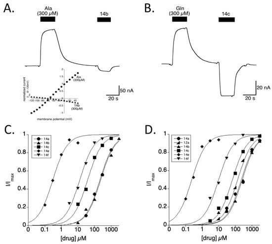 AHPCs block a leak current in SLC1A4 and SLC1A5. (A,B) Representative traces showing the anion current gated by substrates (l-alanine and l-glutamine) or blocked by the AHPCs 14b or 14c (at 300 µM) for SLC1A4 and SLC1A5, respectively. Inset (A): The current and voltage relationship for SLC1A4 currents activated by Ala or blocked by 14b are determined by subtracting voltage jumps in buffer. The leak currents observed with SLC1A4 and SLC1A5 possess a saturable block (C,D), revealed through increasing concentrations of 14e (down triangle), 14f (diamond), 14b (square), 14c (up triangle), 12a (wedge), and 14a (circles). The 50% block is considered the Ki of binding for non-transportable ligands.
