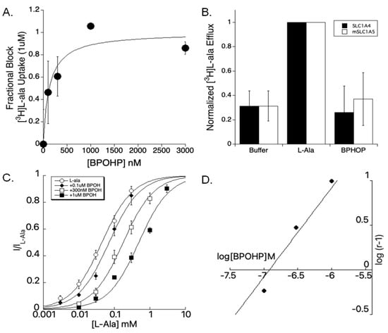 BPOHP 14e characterization as a competitive, non-transportable inhibitor. (A) SLC1A4 injected oocytes where [3H]l-alanine uptake is blocked by BPOHP (IC50 = 128 nM). (B) Radiolabeled [3H]l-alanine exchange for SLC1A4 and SLC1A5. Exchange was normalized to the amount induced by 1 mM l-alanine. No exchange was detected in the presence of 3 µM BPOHP. (C) l-alanine dose–response curves for SLC1A4, showing the right shift with increasing concentrations of BPHOP (0, 0.1, 0.3, 1 µM). (D) A Schild plot showing a linear relationship between [l-ala] dose ratio and four different concentrations of BPOHP, consistent with competitive inhibition.