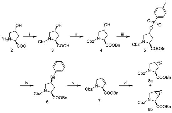 Synthesis of N-Cbz-trans- and cis-3,4-epoxy-proline-benzyl ester 8a and 8b. (i) benzylchloroformate, 1:1 MeOH:H2O, NaOH, rt; (ii) benzylbromide, Na2CO3, cat NaI in DMF, rt; (iii) p-toluenesulfonyl-Cl, pyridine, 0 °C; (iv) diphenyl diselenide, NaBH4 in tBuOH, reflux; (v) CH2Cl2, H2O2 in H2O, 0 °C-RT; (vi) mCPBA, CH2Cl2, reflux.