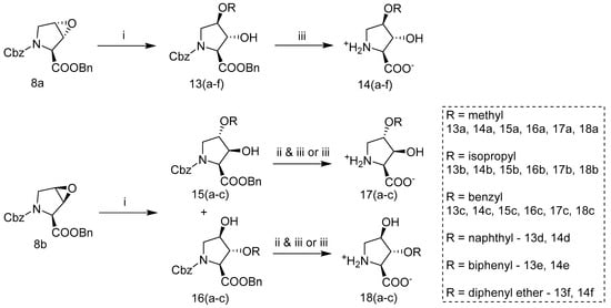 Ether substituted hydroxyprolines were synthesized and explored as potential inhibitors of the SLC1A4/5 transporters. Assembly of this series was accomplished by BF3•Et2O initiated nucleophilic ring opening of epoxide 8a or 8b with a primary alcohol and subsequent Pd-catalyzed hydrogenolysis to produce trans-hydroxy 14(a–f) or, alternatively, to produce cis-hydroxy products 17 and 18 following ester hydrolysis, separation of the regioisomers, and finally hydrogenolysis (Scheme 4) (as specified in supplementary). Nucleophilic addition of alcohols catalyzed with BF3•Et2O provided superior yields compared to addition attempts initiated with p-toluenesulfonic acid that produced byproducts, including fortuitous addition of the tosylate ester later utilized to produce (2S,3R,4S)-3-hydroxy-4-phenoxypyrrolidin-2-carboxylate 12c, see Supplemental Figure S4. Ring opening of trans-epoxide 8a under BF3•Et2O initiated alcohol nucleophilic addition produced one regioisomer exclusively, the N-Cbz-trans-3-hydroxy-cis-4-ether-l-proline benzyl ester 13. Whereas the ring opening of the cis-epoxide 8b produced both regioisomer intermediates 15 and 16 in ratios, 8:1 (as approximated by 1H NMR) (Figure S5), greatly favoring the 3-positioned alcohol intermediates 15(a–c), consistent with azide or HCl ring opening of these epoxides [47,50]. Separation of these regioisomers was carried out by reverse phase HPLC following hydrolysis of the benzyl ester with KOH or just after hydrogenolysis. Of note, though not fully explored, we observed that cis-3-alkyl-ether-trans-4-hydroxy-l-proline isomers 14 may also be obtained from free acid trans-3,4-epoxy-proline 8c (Scheme 3) via BF3•Et2O initiated addition under similar conditions. Benzyl carbamate deprotection of ether substituted intermediates 13, 15, or 16 was again accomplished via palladium catalyzed hydrogenolysis under H2 (g) affording final products 14, 17, or 18. Importantly, we found that selective hydrogenolysis could be achieved via addition of ammonium acetate (NH4OAc) as an amine-based inhibitor of debenzylation during palladium catalyzed hydrogenolysis [51,52].