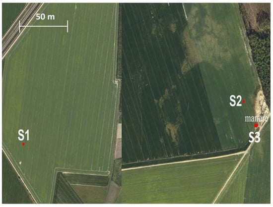 Soil samples were taken directly from the surface layer (0–30 cm) of the arable lands in the Warmia and Masuria voivodeship in Poland in an early spring 2021. Soil 1 was from the arable field regularly fertilized with the manure and soils 2 and 3 were from the field in near the manure pile (See Figure 1). Additionally, manure samples were collected from the interior of the poultry houses and from the manure pile, located outdoors.