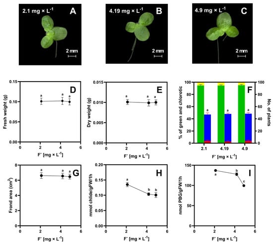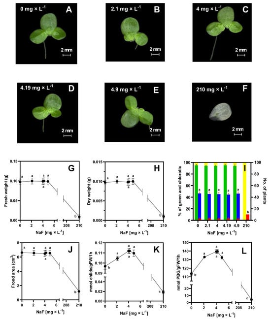 General appearance of plants after 7 days of growth in simulated soil extracts (50% MS medium + F−)—(A–F); fresh weight [g]—(G); dry weight [g]—(H); percent frequency of green plants (green bar), percent frequency of yellow fronds (yellow bar), number of green plants (blue bar), number of yellow plants (red bar)—(I); surface area [cm2]—(J); chlorophyllase activity [mmol of chlorophyllide produced per 1 g of fresh weight within 1 h]—(K) and aminolevulinic acid dehydratase activity [as nmol of porphobilinogen produced per 1 g of fresh weight within 1 h]—(L). Tests were conducted in triplicates. The one-way analysis of variance (ANOVA) was carried out using Tukey’s post hoc test (p ≤ 0.05). Small letters represent groups of significant difference.