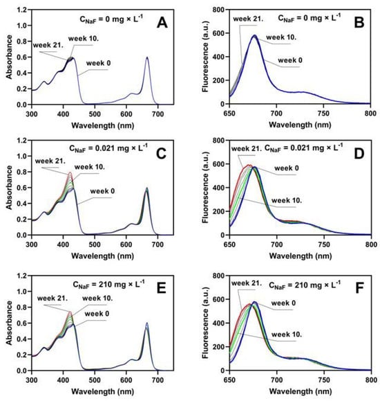Absorption (A) and fluorescence (B) of chlorophyll a without NaF or with 0.021 mg × L−1 NaF (C,D), or with 210 mg × L−1 NaF (E,F). In the figures, the blue line marks the beginning of the reaction, the green line marks the 10th week, and the red line marks the 21st week of the reaction of chlorophyll with fluorine ions.