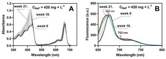 By carefully analyzing the Qy band for the max dose of NaF (Figure 5A), we see that until the 10th week, the absorption band for chlorophyll decreases, and then this band shifts significantly to the shortwave direction, and an increase in the newly formed band at a wavelength of λ = 672 nm is observed. The value of this band reaches its maximum at a concentration of 420 mg × L−1. The Soret band is changing significantly already in the 10th week. Its vibronic structure is lost and a new band of the complex is created at a wavelength of λ = 421 nm with a maximum of A = 1.026, for which the absorbance value in week 21 was almost twice as high as for chlorophyll a with CNaF = 0.021 mg × L−1 (Figure 5).