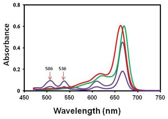 Absorption of chlorophyll (―), pheophytin in concentration 1 × 10−5 M (―), and a new product of chlorophyll reaction with fluoride (―). The arrows show two peaks characteristic for pheophytin at 506 and 536 nm.