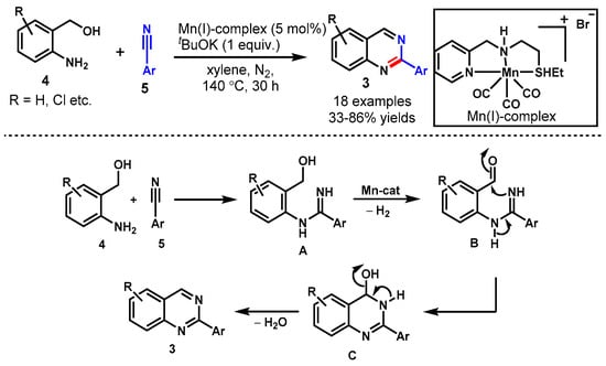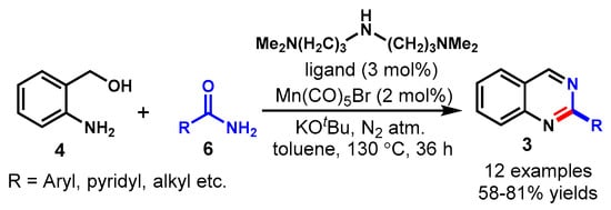 - Das, K.; Mondal, A.; Pal, D.; Srimani, D. Sustainable Synthesis of Quinazoline and 2-Aminoquinoline via Dehydrogenative Coupling of 2-Aminobenzyl Alcohol and Nitrile Catalyzed by Phosphine-Free Manganese Pincer Complex. Org. Lett. 2019, 21, 3223–3227. [Google Scholar] [CrossRef] [PubMed]