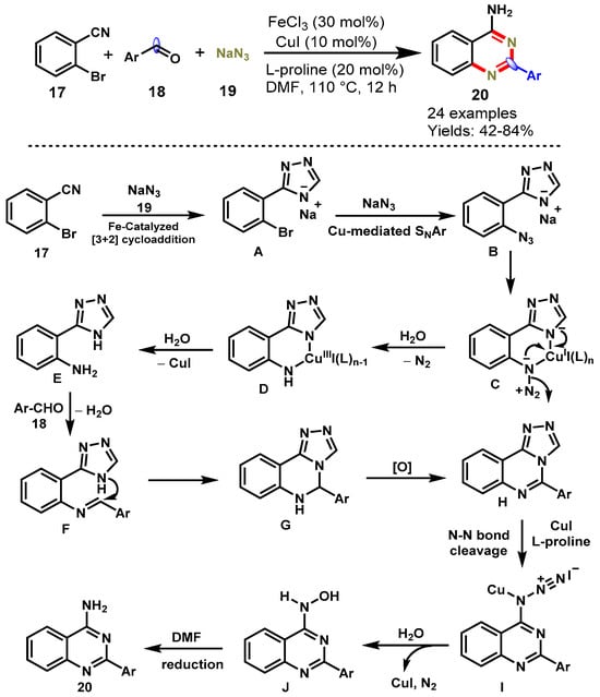 - Jia, F.-C.; Zhou, Z.-W.; Xu, C.; Cai, Q.; Li, D.-K.; Wu, A.-X. Expeditious synthesis of 2-phenylquinazolin-4-amines via a Fe/Cu relay-catalyzed domino strategy. Org. Lett. 2015, 17, 4236–4239. [Google Scholar] [CrossRef] [PubMed]