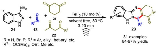 - Shinde, V.V.; Jeong, Y.T. Sonochemical FeF3 catalyzed three-component synthesis of densely functionalized tetrahydroindazolo [3,2-b] quinazoline under solvent-free conditions. Tetrahedron Lett. 2016, 57, 3795–3799. [Google Scholar] [CrossRef]