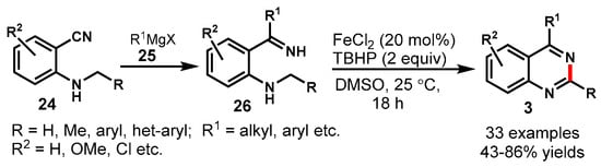 - Chen, C.-y.; He, F.; Tang, G.; Yuan, H.; Li, N.; Wang, J.; Faessler, R. Synthesis of quinazolines via an iron-catalyzed oxidative amination of N–H ketimines. J. Org. Chem. 2018, 83, 2395–2401. [Google Scholar] [CrossRef] [PubMed]