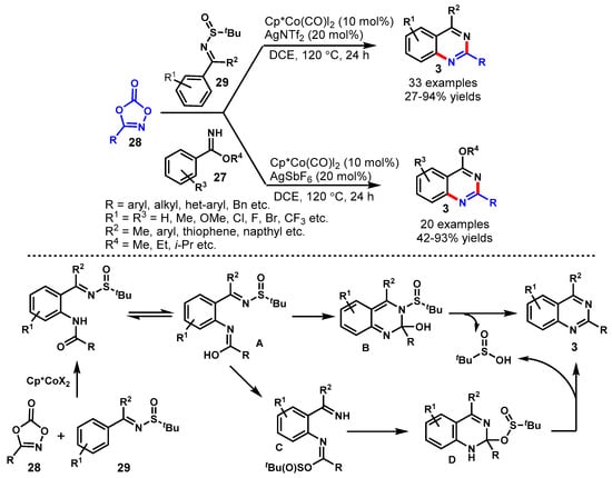 - Wang, F.; Wang, H.; Wang, Q.; Yu, S.; Li, X. Co (III)-catalyzed synthesis of quinazolines via C–H activation of N-sulfinylimines and benzimidates. Org. Lett. 2016, 18, 1306–1309. [Google Scholar] [CrossRef] [PubMed]