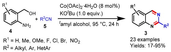 - Hao, Z.; Zhou, X.; Ma, Z.; Zhang, C.; Han, Z.; Lin, J.; Lu, G.-L. Dehydrogenative Synthesis of Quinolines and Quinazolines via Ligand-Free Cobalt-Catalyzed Cyclization of 2-Aminoaryl Alcohols with Ketones or Nitriles. J. Org. Chem. 2022, 87, 12596–12607. [Google Scholar] [CrossRef] [PubMed]