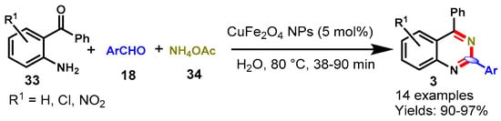 - Baghbanian, S.M.; Farhang, M. CuFe2O4 nanoparticles: A magnetically recoverable and reusable catalyst for the synthesis of quinoline and quinazoline derivatives in aqueous media. RSC Adv. 2014, 4, 11624–11633. [Google Scholar] [CrossRef]