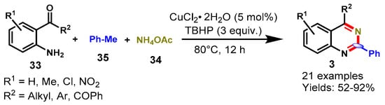 - Liang, E.; Wu, Y.; Chen, J.; Xiong, W.; Zhao, J.; Yao, X.; Tang, X. Copper-catalyzed aerobic oxidative cyclization protocol for the synthesis of quinazolines via amination of C (sp3)-H bonds of methylazaarenes. Tetrahedron 2019, 75, 130783. [Google Scholar] [CrossRef]