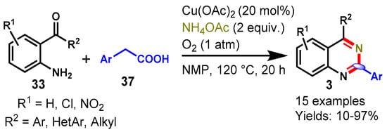 - Yan, Y.; Shi, M.; Niu, B.; Meng, X.; Zhu, C.; Liu, G.; Chen, T.; Liu, Y. Copper-catalyzed aerobic oxidative decarboxylative amination of arylacetic acids: A facile access to 2-arylquinazolines. RSC Adv. 2016, 6, 36192–36197. [Google Scholar] [CrossRef]
