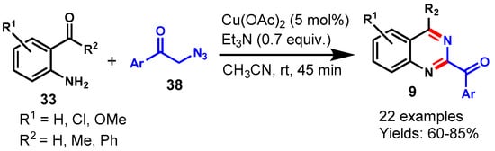 - Visweswara Sastry, K.N.; Prasad, B.; Nagaraju, B.; Ganga Reddy, V.; Alarifi, A.; Babu, B.N.; Kamal, A. Copper-Catalysed Tandem Synthesis of Substituted Quinazolines from Phenacyl Azides and O-Carbonyl Anilines. ChemistrySelect 2017, 2, 5378–5383. [Google Scholar] [CrossRef]