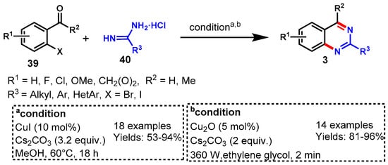- Wang, C.; Li, S.; Liu, H.; Jiang, Y.; Fu, H. Copper-catalyzed synthesis of quinazoline derivatives via ullmann-type coupling and aerobic oxidation. J. Org. Chem. 2010, 75, 7936–7938. [Google Scholar] [CrossRef] [PubMed]