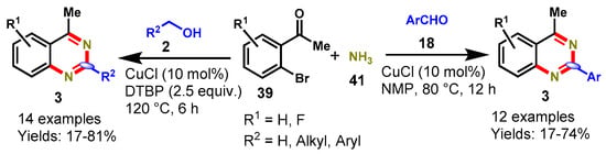 - Maiden, T.; Harrity, J. Recent developments in transition metal catalysis for quinazolinone synthesis. Org. Biomol. Chem. 2016, 14, 8014–8025. [Google Scholar] [CrossRef] [PubMed]