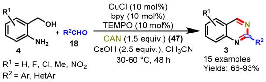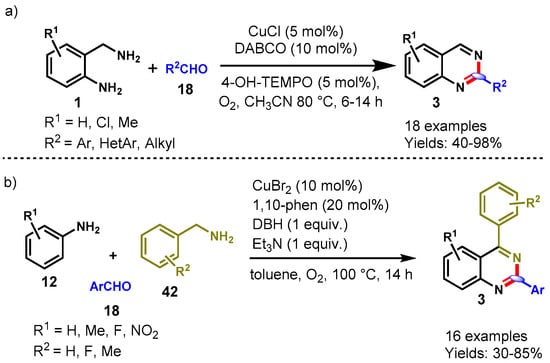 - Han, B.; Yang, X.-L.; Wang, C.; Bai, Y.-W.; Pan, T.-C.; Chen, X.; Yu, W. CuCl/DABCO/4-HO-TEMPO-Catalyzed Aerobic Oxidative Synthesis of 2-Substituted Quinazolines and 4 H-3,1-Benzoxazines. J. Org. Chem. 2011, 77, 1136–1142. [Google Scholar] [CrossRef] [PubMed]