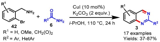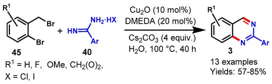 - Malakar, C.C.; Baskakova, A.; Conrad, J.; Beifuss, U. Copper-Catalyzed Synthesis of Quinazolines in Water Starting from o-Bromobenzylbromides and Benzamidines. Chem. A Eur. J. 2012, 18, 8882–8885. [Google Scholar] [CrossRef] [PubMed]