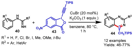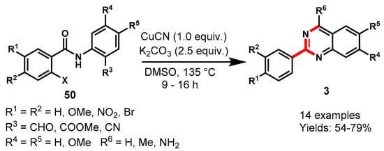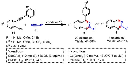 - Wang, X.; He, D.; Huang, Y.; Fan, Q.; Wu, W.; Jiang, H. Copper-Catalyzed Synthesis of Substituted Quinazolines from Benzonitriles and 2-Ethynylanilines via Carbon–Carbon Bond Cleavage Using Molecular Oxygen. J. Org. Chem. 2018, 83, 5458–5466. [Google Scholar] [CrossRef] [PubMed]