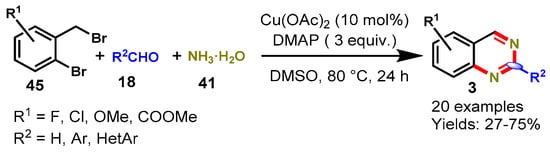 - Ju, J.; Hua, R.; Su, J. Copper-catalyzed three-component one-pot synthesis of quinazolines. Tetrahedron 2012, 68, 9364–9370. [Google Scholar] [CrossRef]