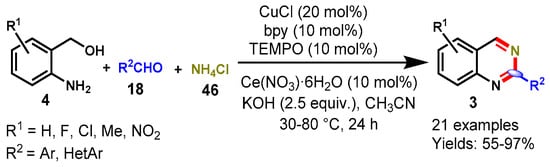 - Gopalaiah, K.; Saini, A.; Devi, A. Iron-catalyzed cascade reaction of 2-aminobenzyl alcohols with benzylamines: Synthesis of quinazolines by trapping of ammonia. Org. Biomol. Chem. 2017, 15, 5781–5789. [Google Scholar] [CrossRef] [PubMed]
