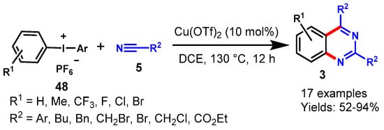 - Su, X.; Chen, C.; Wang, Y.; Chen, J.; Lou, Z.; Li, M. One-pot synthesis of quinazoline derivatives via [2 + 2 + 2] cascade annulation of diaryliodonium salts and two nitriles. Chem. Commun. 2013, 49, 6752–6754. [Google Scholar] [CrossRef] [PubMed]