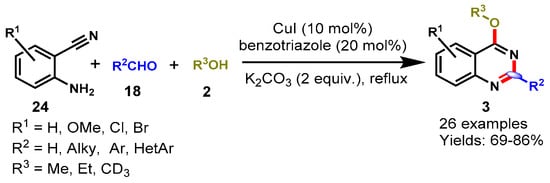 - Zhang, W.; Guo, F.; Wang, F.; Zhao, N.; Liu, L.; Li, J.; Wang, Z. Synthesis of quinazolines via CuO nanoparticles catalyzed aerobic oxidative coupling of aromatic alcohols and amidines. Org. Biomol. Chem. 2014, 12, 5752–5756. [Google Scholar] [CrossRef] [PubMed]