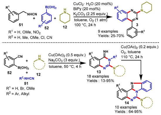 - Rodrigues, R.; Tran, L.Q.; Darses, B.; Dauban, P.; Neuville, L. Copper-Promoted Tandem Three-Component Access to Quinazolin-4 (H)-imines and Benzimidazo [1, 2-c] quinazolines. Adv. Synth. Catal. 2019, 361, 4454–4460. [Google Scholar] [CrossRef]