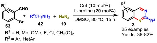 - Xu, C.; Jia, F.-C.; Zhou, Z.-W.; Zheng, S.-J.; Li, H.; Wu, A.-X. Copper-catalyzed multicomponent domino reaction of 2-bromoaldehydes, benzylamines, and sodium azide for the assembly of quinazoline derivatives. J. Org. Chem. 2016, 81, 3000–3006. [Google Scholar] [CrossRef]