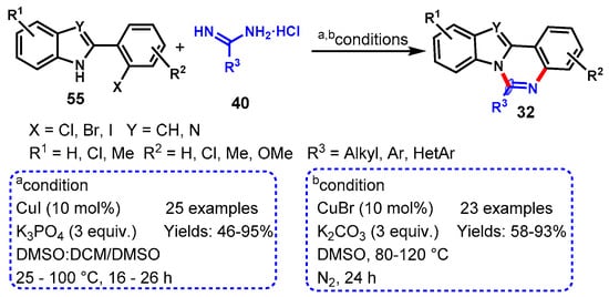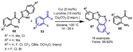 - Li, C.; Zhang, W.-T.; Wang, X.-S. CuI-Catalyzed C–N Bond Formation and Cleavage for the Synthesis of Benzimidazo [1,2-a] quinazoline Derivatives. J. Org. Chem. 2014, 79, 5847–5851. [Google Scholar] [CrossRef] [PubMed]