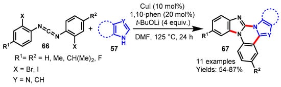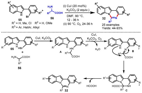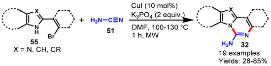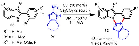 - Diep, T.D.; Dao, P.D.Q.; Ho, S.L.; Cho, C.S. Copper-Catalyzed Synthesis of Trinuclear N-Fused Hybrid Scaffolds by Double C (sp2)-N Bond Formation between 2-(2-Bromoaryl) indoles and 2-Aminoazoles. Eur. J. Org. Chem. 2020, 2020, 2807–2812. [Google Scholar] [CrossRef]