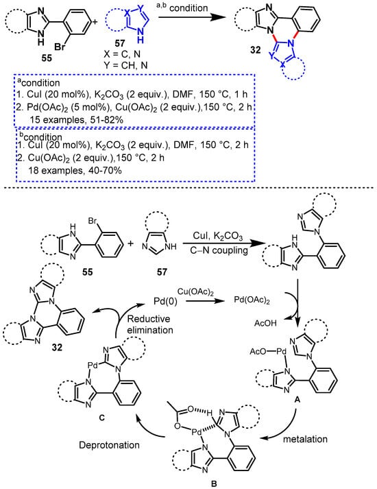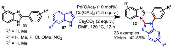 - Guo, X.; Hu, J.; Zhang, M.; Wang, L. Palladium-Catalyzed C (sp2)−H Activation for the Formation of C−N Bonds: Rapid Access to Benzimidazoquinazolines. Asian J. Org. Chem. 2019, 8, 417–421. [Google Scholar] [CrossRef]