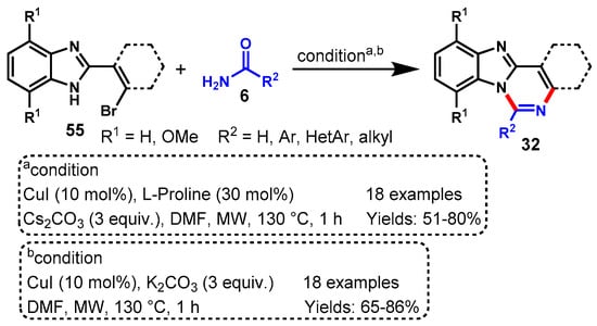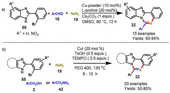 - Xu, S.; Lu, J.; Fu, H. Copper-catalyzed cascade synthesis of benzimidazoquinazoline derivatives under mild condition. Chem. Commun. 2011, 47, 5596–5598. [Google Scholar] [CrossRef] [PubMed]