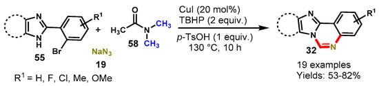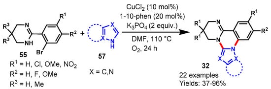 - Chen, D.; Huang, L.; Yang, J.; Ma, J.; Zheng, Y.; Luo, Y.; Shen, Y.; Wu, J.; Feng, C.; Lv, X. Copper-catalyzed C–N coupling/C–H functionalization: A tandem approach to azole-fused quinazoline derivatives. Tetrahedron Lett. 2018, 59, 2005–2009. [Google Scholar] [CrossRef]