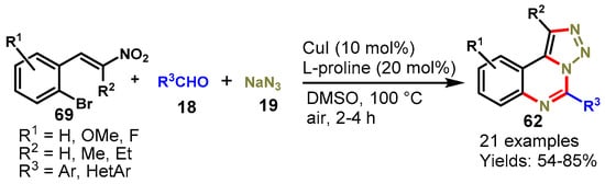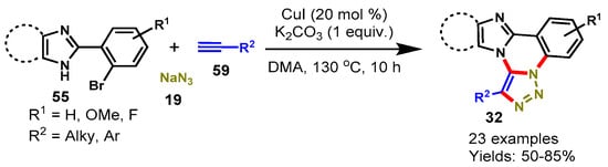 - Jia, F.-C.; Xu, C.; Zhou, Z.-W.; Cai, Q.; Li, D.-K.; Wu, A.-X. Consecutive cycloaddition/SNAr/reduction/cyclization/oxidation sequences: A copper-catalyzed multicomponent synthesis of fused N-heterocycles. Org. Lett. 2015, 17, 2820–2823. [Google Scholar] [CrossRef]