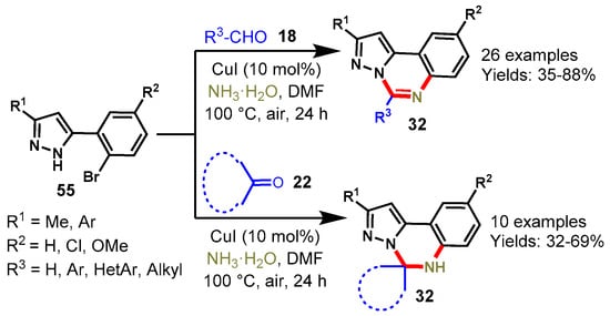 - Guo, S.; Wang, J.; Fan, X.; Zhang, X.; Guo, D. Synthesis of pyrazolo [1,5-c] quinazoline derivatives through copper-catalyzed tandem reaction of 5-(2-bromoaryl)-1 H-pyrazoles with carbonyl compounds and aqueous ammonia. J. Org. Chem. 2013, 78, 3262–3270. [Google Scholar] [CrossRef] [PubMed]