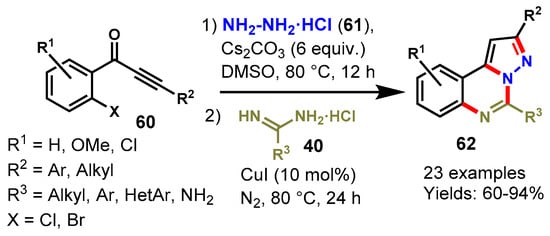 - Liu, L.; Li, L.; Mao, S.; Wang, X.; Zhou, M.; Zhao, Y.-l.; Wang, H. Synthesis of Pyrazolo [1,5-c] quinazoline Derivatives through Copper-Catalyzed Domino Reaction of o-Alkenyl Aromatic Isocyanides with Diazo Compounds. Chem. Commun. 2020, 56, 7665–7668. [Google Scholar] [CrossRef]