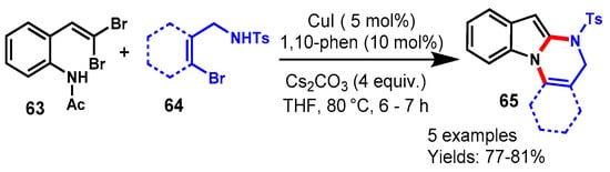 - Kiruthika, S.E.; Perumal, P.T. CuI-Catalyzed Coupling of gem-Dibromovinylanilides and Sulfonamides: An Efficient Method for the Synthesis of 2-Amidoindoles and Indolo [1,2-a] quinazolines. Org. Lett. 2013, 16, 484–487. [Google Scholar] [CrossRef] [PubMed]