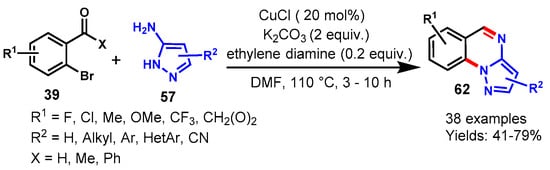 - Gao, L.; Song, Y.; Zhang, X.; Guo, S.; Fan, X. Copper-catalyzed tandem reactions of 2-bromobenzaldehydes/ketones with aminopyrazoles toward the synthesis of pyrazolo [1,5-a] quinazolines. Tetrahedron Lett. 2014, 55, 4997–5002. [Google Scholar] [CrossRef]