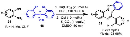 - Pang, X.; Chen, C.; Su, X.; Li, M.; Wen, L. Diverse tandem cyclization reactions of o-cyanoanilines and diaryliodonium salts with copper catalyst for the construction of quinazolinimine and acridine scaffolds. Org. Lett. 2014, 16, 6228–6231. [Google Scholar] [CrossRef]