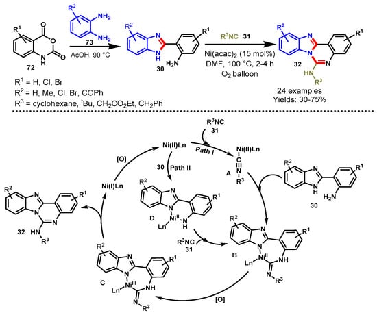 - Shinde, A.H.; Arepally, S.; Baravkar, M.D.; Sharada, D.S. Nickel-Catalyzed Aerobic Oxidative Isocyanide Insertion: Access to Benzimidazoquinazoline Derivatives via a Sequential Double Annulation Cascade (SDAC) Strategy. J. Org. Chem. 2016, 82, 331–342. [Google Scholar] [CrossRef] [PubMed]