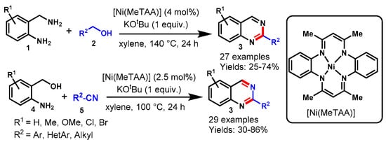 - Chakraborty, G.; Sikari, R.; Das, S.; Mondal, R.; Sinha, S.; Banerjee, S.; Paul, N.D. Dehydrogenative synthesis of quinolines, 2-aminoquinolines, and quinazolines using singlet diradical Ni (II)-catalysts. J. Org. Chem. 2019, 84, 2626–2641. [Google Scholar] [CrossRef] [PubMed]