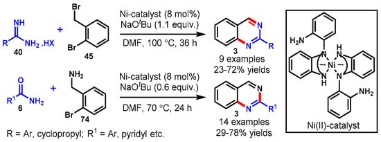 - Parua, S.; Sikari, R.; Sinha, S.; Chakraborty, G.; Mondal, R.; Paul, N.D. Accessing Polysubstituted Quinazolines via Nickel Catalyzed Acceptorless Dehydrogenative Coupling. J. Org. Chem. 2018, 83, 11154–11166. [Google Scholar] [CrossRef]
