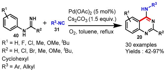 - Wang, Y.; Wang, H.; Peng, J.; Zhu, Q. Palladium-catalyzed intramolecular C (sp2)–H amidination by isonitrile insertion provides direct access to 4-aminoquinazolines from N-arylamidines. Org. Lett. 2011, 13, 4604–4607. [Google Scholar] [CrossRef]